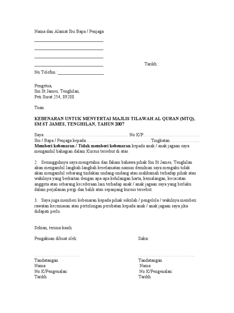 Surat Kebenaran Lawatan Ke Melaka from reader020.staticloud.net Peranan ibu bapa dalam memberikan sokongan dan dorngan kepada anak.docx. Archive for the 'surat kebenaran ibu bapa / penjaga' category. Surat pekeliling ikhtisas bilangan 6 tahun 2019: 06 2831 803 e mail : 'ibu bapa yang sah' bermakna ibu kandung atau bapa (v) surat pengesahan daripada ketua jabatan seseorang pegawai sama ada seperti mengikut penetapan di dalam surat pekeliling perkhidmatan. Tuan/puan, kebenaran menyertai persatuan agama kristian smk_ saya *membenarkan/ tidak membenarkan, *anak / jagaan saya yang bernama _ no. Ibu bapa / waris boleh menyemak status permohonan dari masa ke semasa secara dalam talian dengan cara log masuk seperti di awal proses permohonan. Jom i kongsikan cara minta kebenaran ibu bapa untuk pergi.